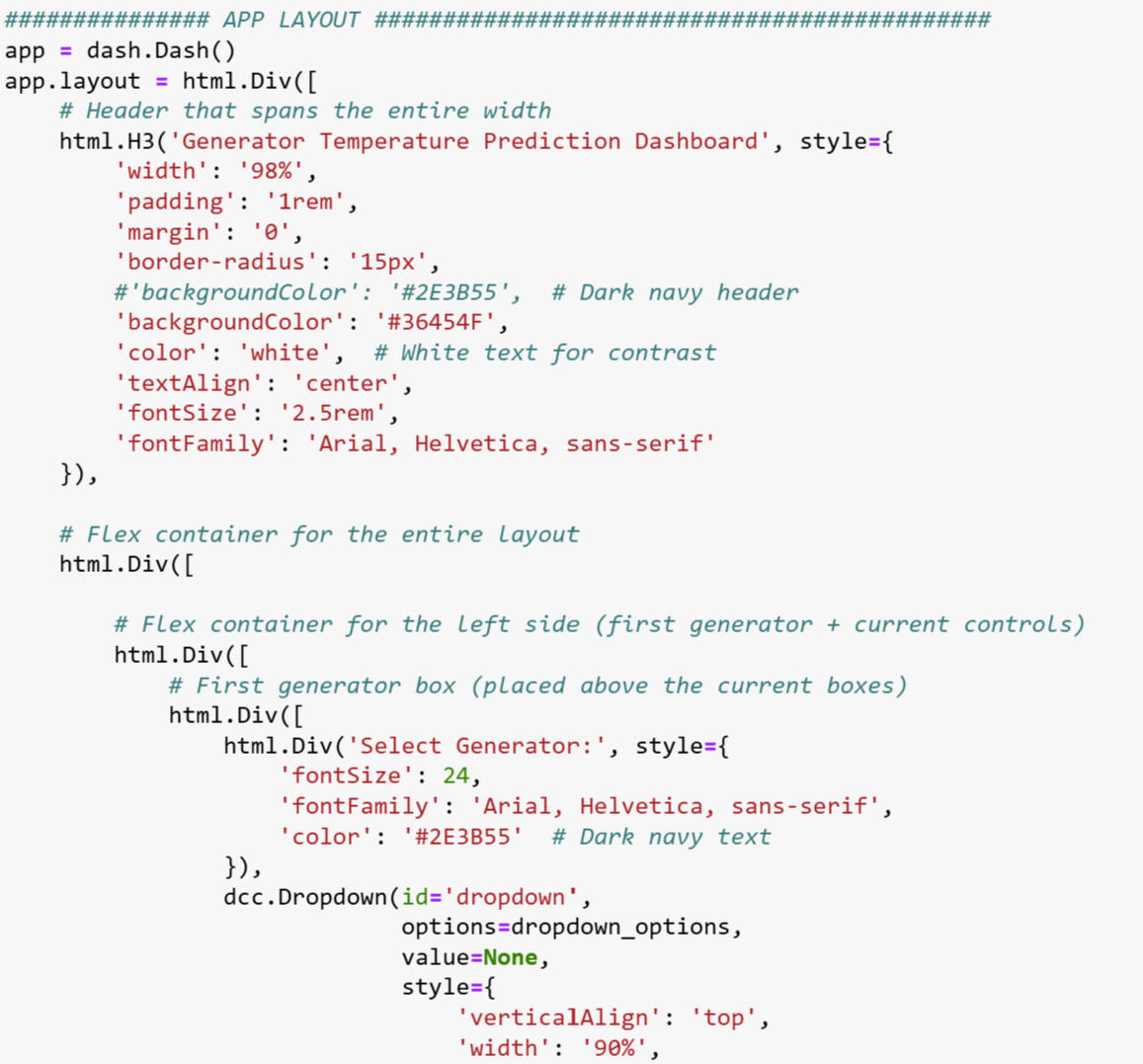 This Generator Temperature Prediction Dashboard was developed using Python, leveraging Dash and Plotly to create an interactive and user-friendly interface. The dashboard enables users to monitor and predict generator temperatures by adjusting model parameters and selecting specific time frames via a date picker. The project integrates both backend and frontend functionalities within Python, using a variety of packages to handle data processing, model predictions, and visualizations.