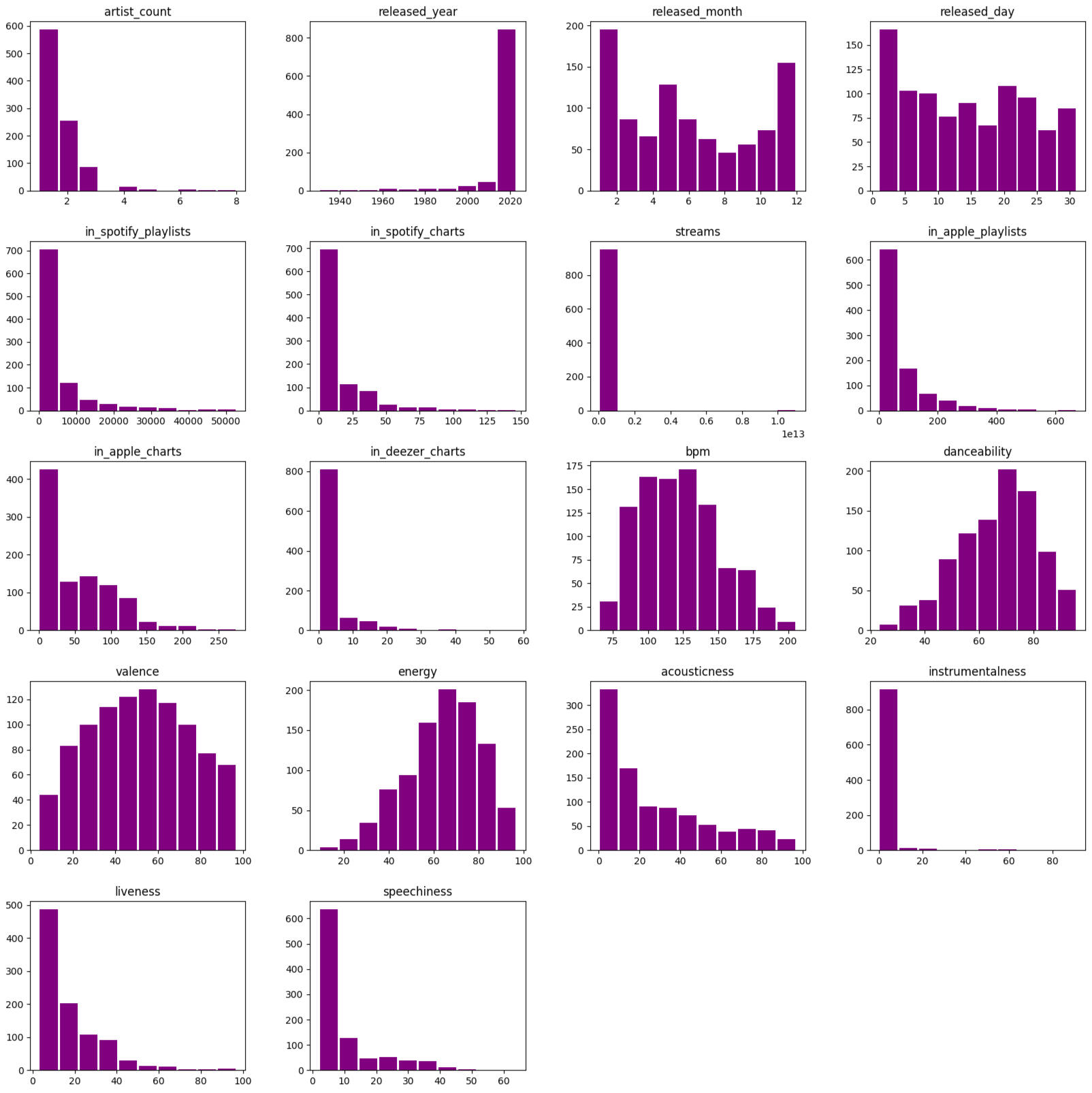 This data was obtained from Kaggle. The dataset includes various information such as artist name, song name, mode, key, bpm, etc.