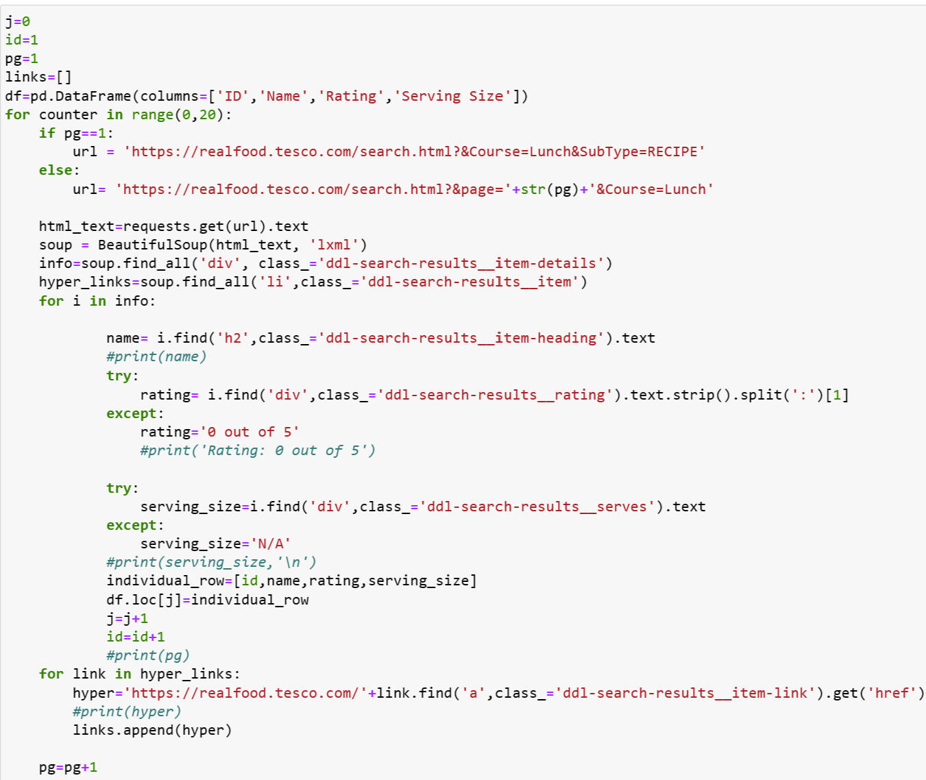 Developed a code in python to obtain food name, recipe, serving size, etc. from Tesco.com