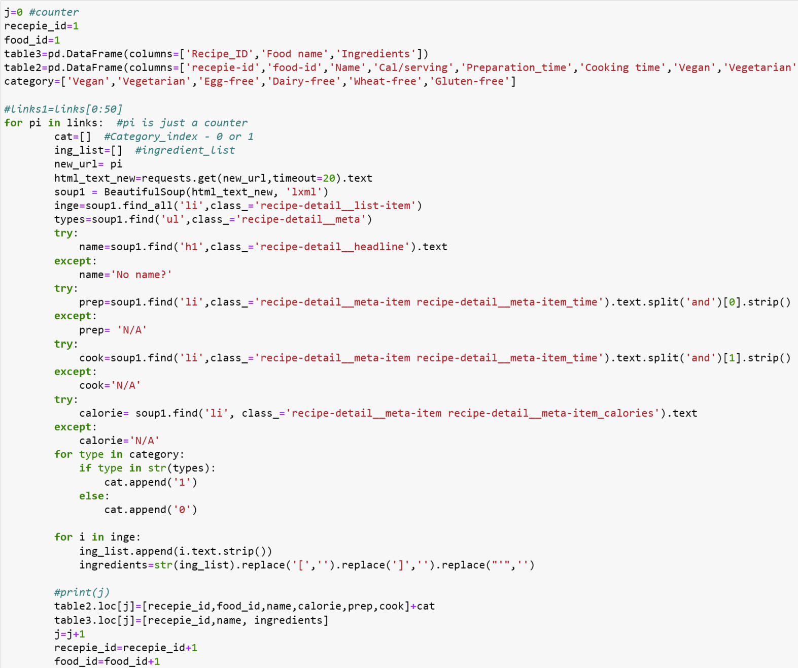 This website has a comprehensive food data for breakfast, lunch, snacks, salads, and dinner. For now, I only scrapped the lunch food ideas. Using for loops, I iteretaviley looped through each page and obtained the neede information.