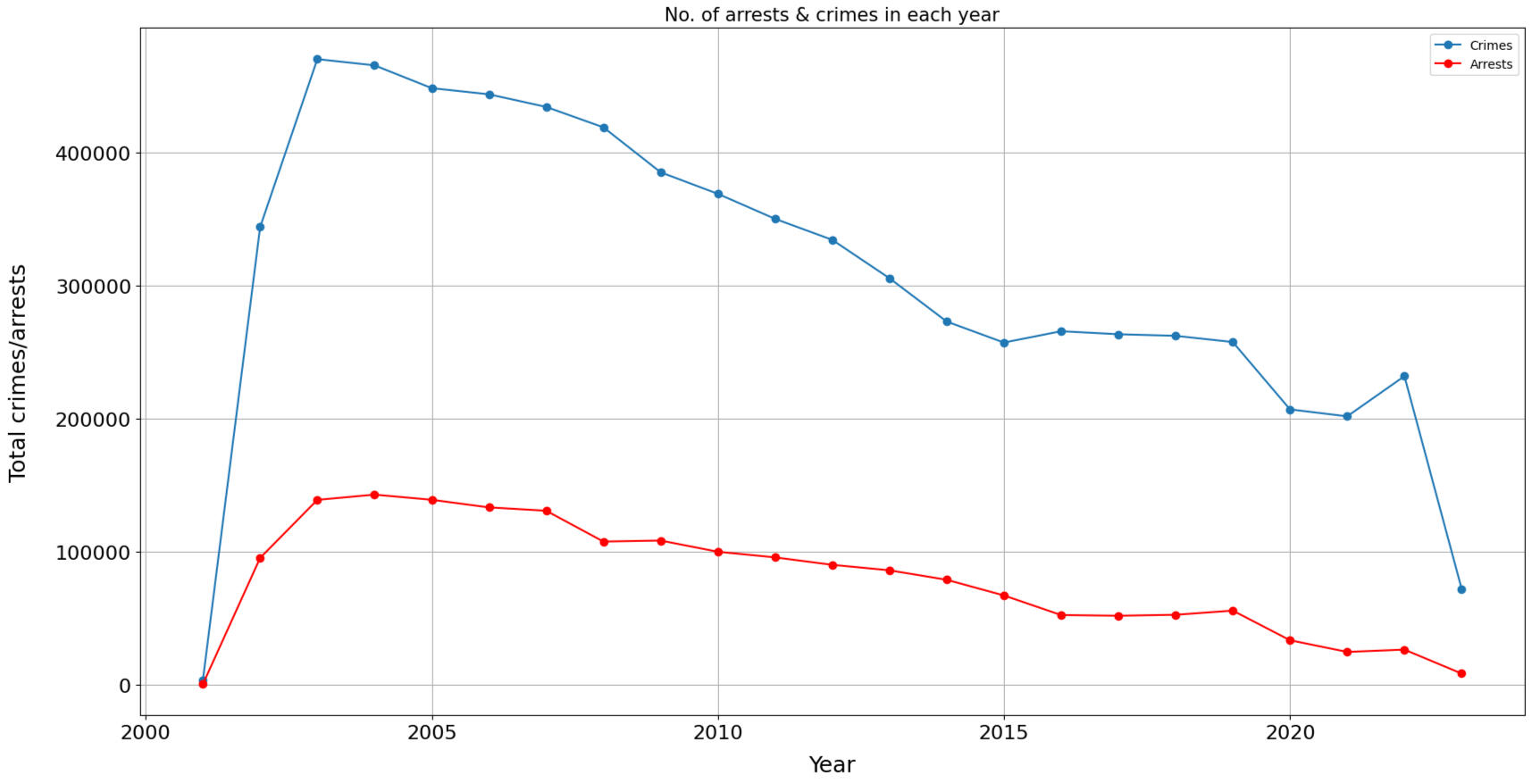 This data was obtained from Kaggle data and the original data was collected by the city of Chicago for public use, pertaining to all crime data which occurred between 2001 and 2023. The data contains the date of the crime, where it was committed as well as the type of crime committed. The total number of columns and rows are 22 and 7784664, respectively.