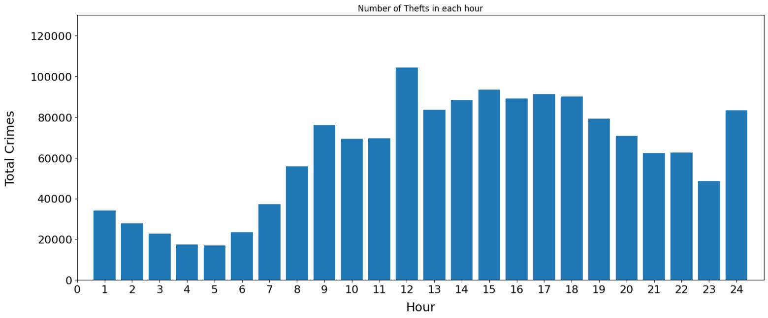To get further insight into thefts as the most occured crime, we found the distrubtion of number of thefts versus each hour in a day. Results indicate that almost 105,000 crimes happend around noon!