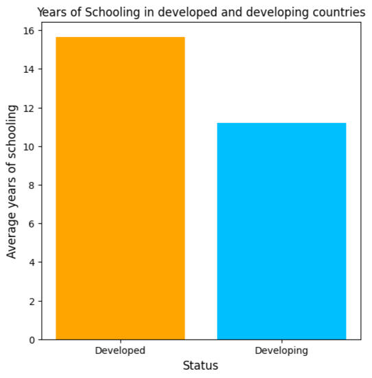 In the examination of factors influencing life expectancy, it is observed that years of schooling tend to be higher in developed countries as opposed to developing countries.