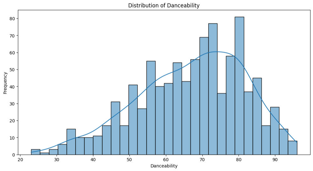 Let's see the distribution of danceability in the songs. It seems that a fairly high number of songs have a relatively high degree of danceability.